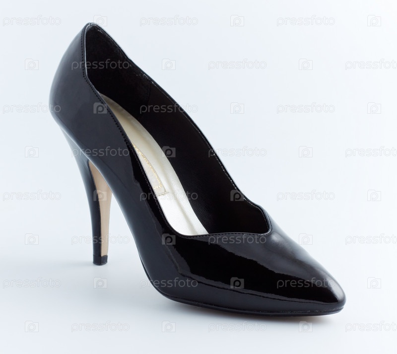 Женский черный лакированный туфель на высоком каблуке, на сером фоне