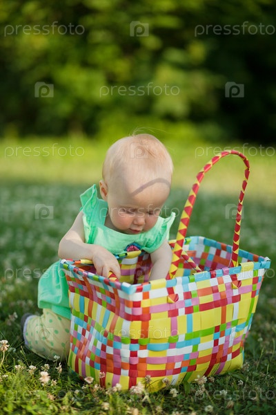 Маленькая девочка заглядывает в сумку, в летнем парке
