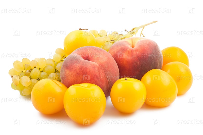 Персики, сливы и виноград на белом фоне