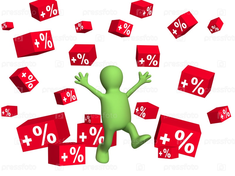 Счастливый человечек среди падающих коробок с символами плюс и процент