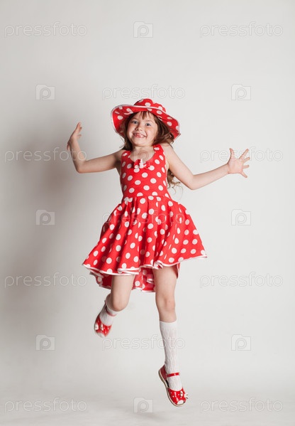 Девочка в красном платье в горошек весело танцует на сером фоне