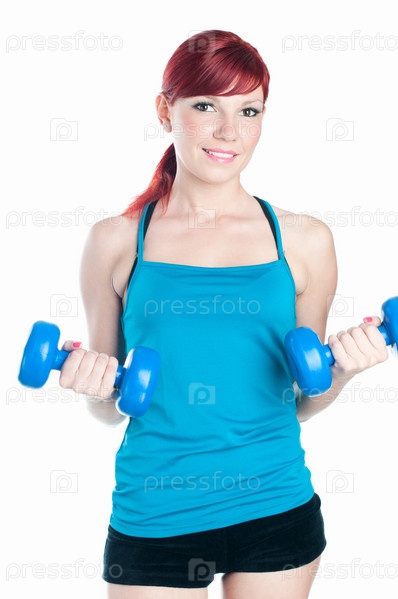 Спортивная рыжеволосая девушка с гантелями, изолированная на белом фоне