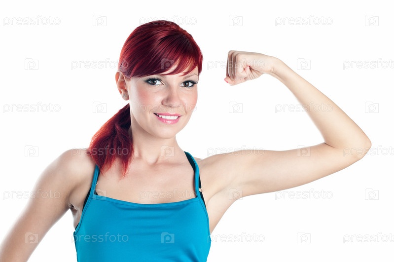 Спортивная молодая девушка демонстрирует бицепс, изолированная на белом фоне