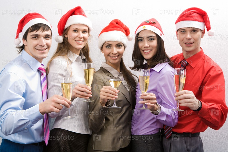 Портрет деловых партнеров, одетых в шляпы Санты и держащих флейту с шампанским