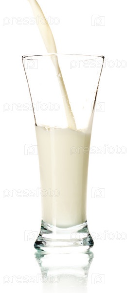 Молоко наливают в стеклянный стакан, изолированое на белом фоне
