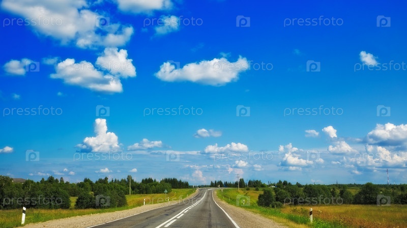 Скоростное шоссе в лесу, под чистым голубым небом