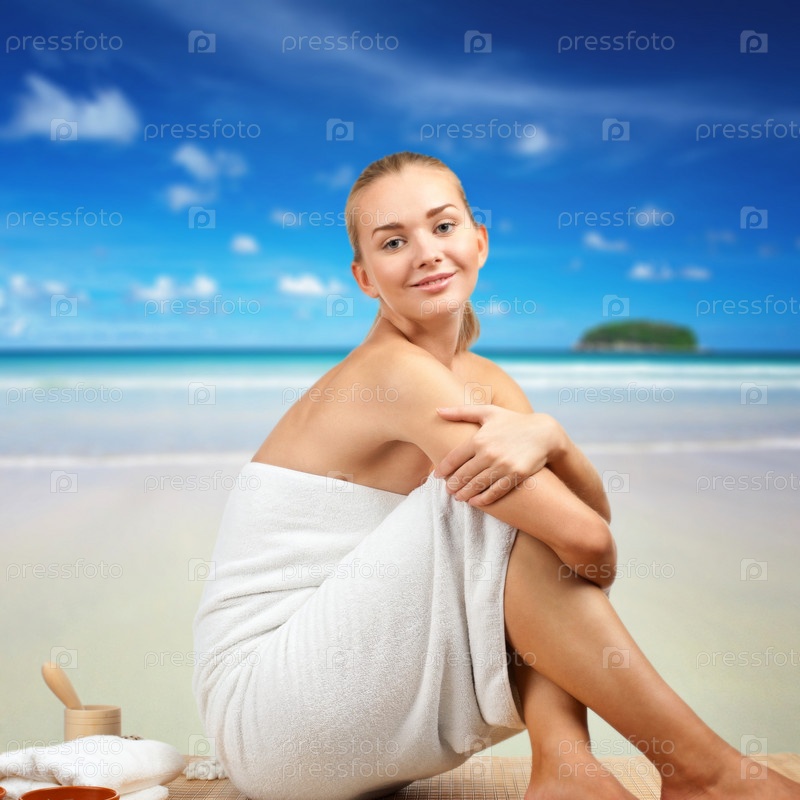 Портрет красивой девушки в белом полотенце на фоне синего неба