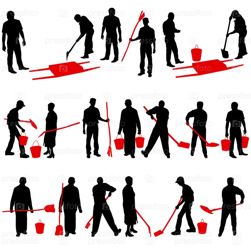 Силуэты мужчин и женщин с лопатами и ведрами