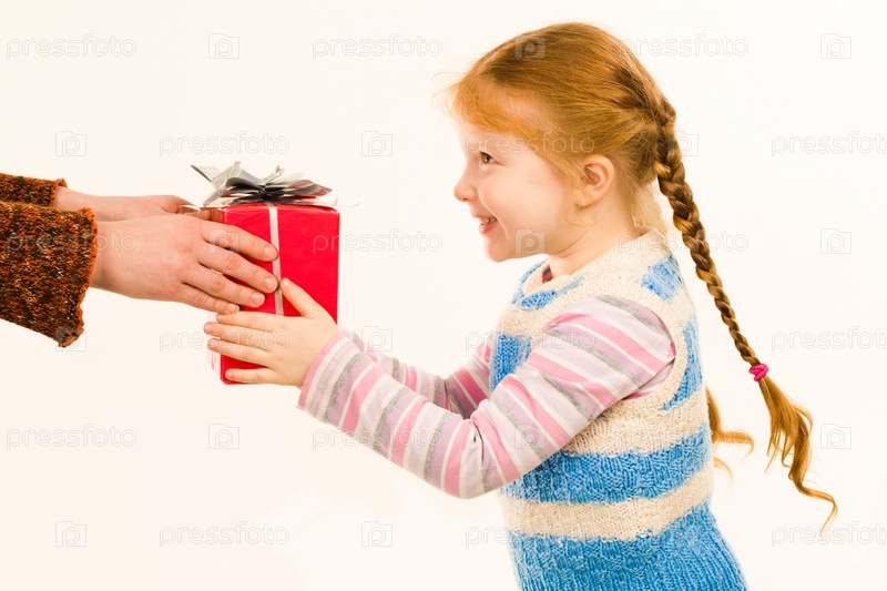 Изображение счастливого ребенка, держащего руки в коробке для подарков, которую дарит женщина