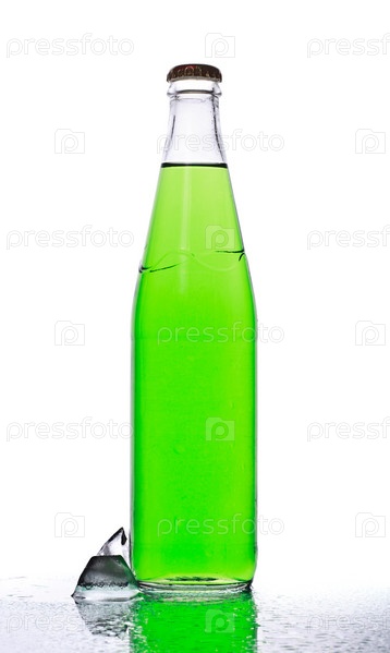 Зеленая газировка в бутылке и кубик льда, на белом фоне