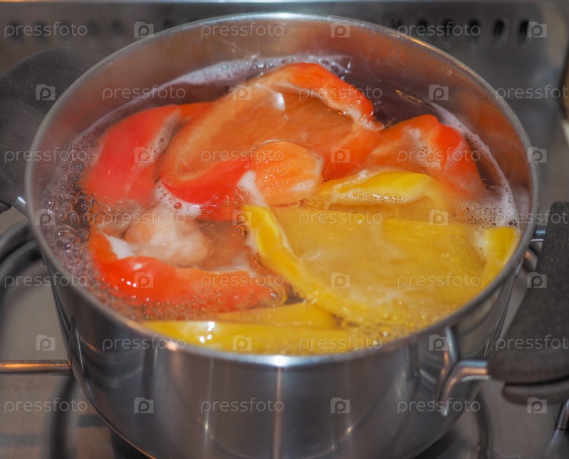Желтый и красный перец в кастрюле на газовой плите