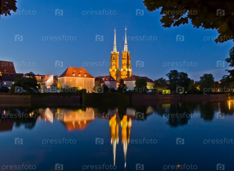 Ночной вид острова Тумский во Вроцлаве, Польша