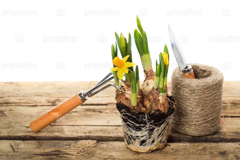 Садовые инструменты и цветок в горшке
