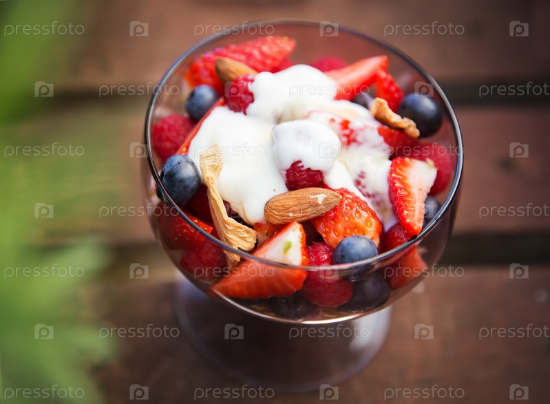 Свежий йогурт с фруктами и мюсли на завтрак