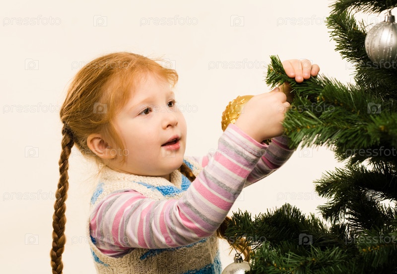 Фото красивой рыжеволосой девушки, вешающей хорошие игрушки на ветвях сосны
