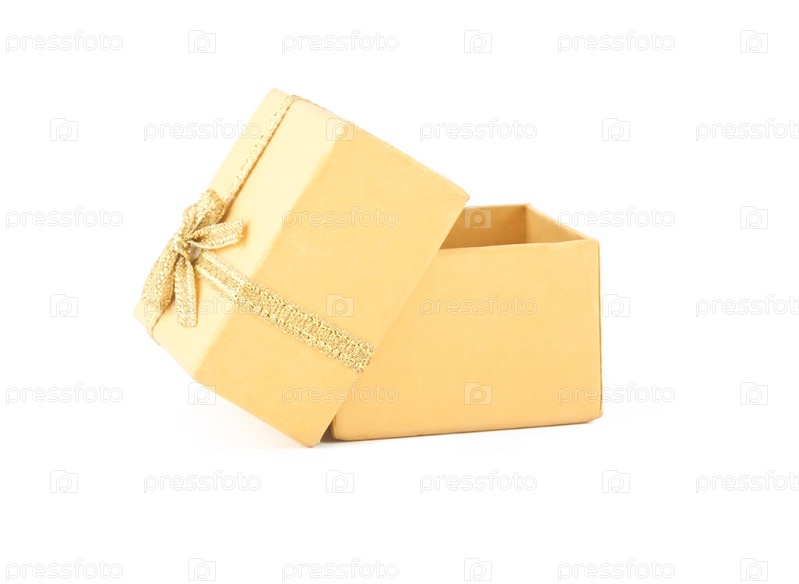 Желтая открытая подарочная коробка, изолирована на белом фоне