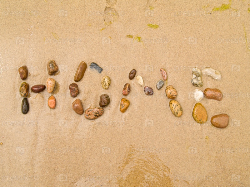 Слово "дом" написанное камешками на морском берегу - концепция