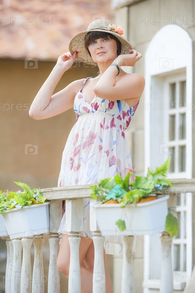 Романтичная брюнетка в шляпе на балконе дома