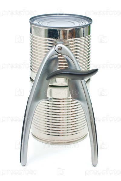 Металлические банки и открыватель для банок изолированы на белом фоне