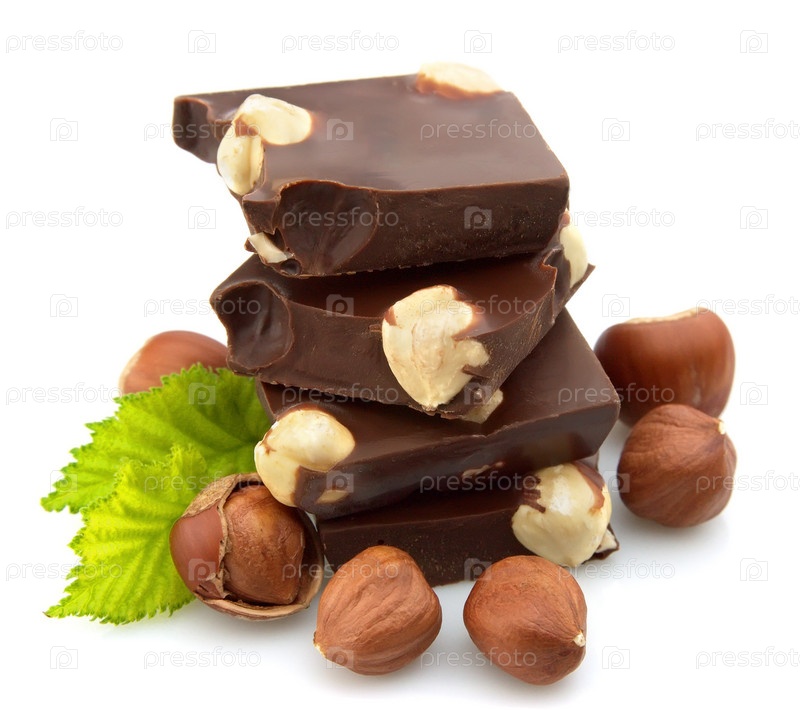 Кусочки темного шоколада с лесными орешками на белом фоне