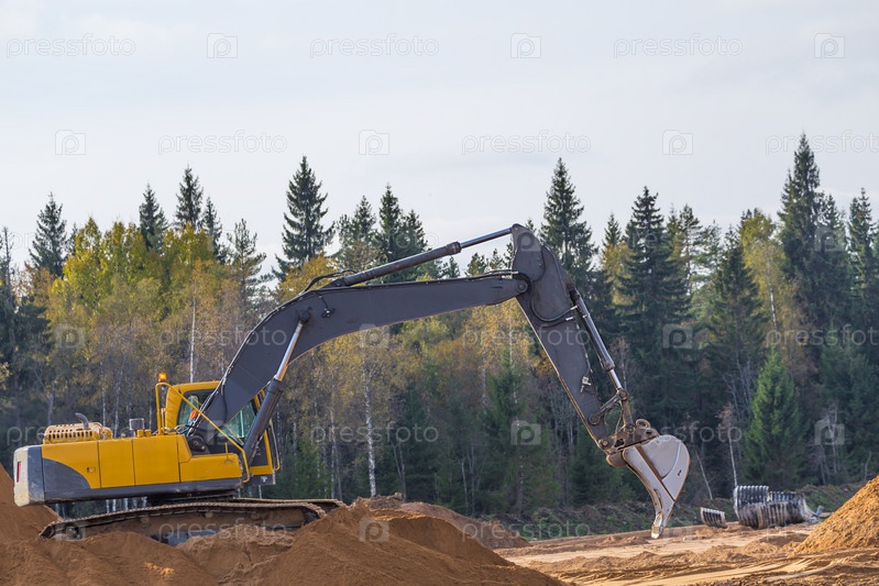 Желтый экскаватор за работой