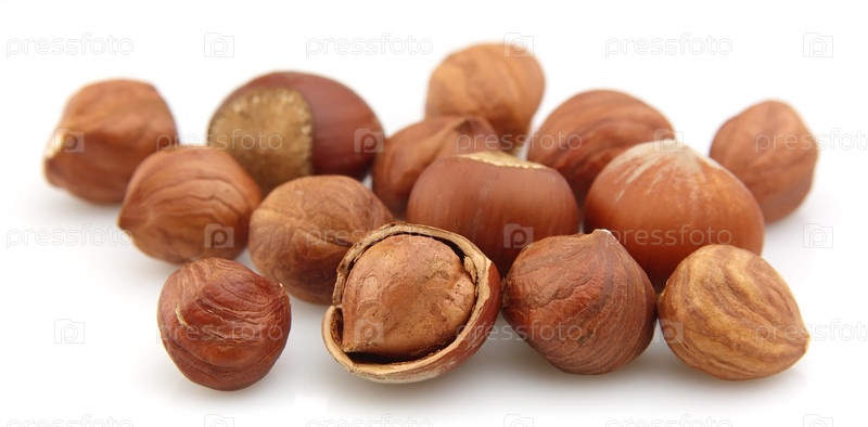 Кучка лесных орешков на белом фоне