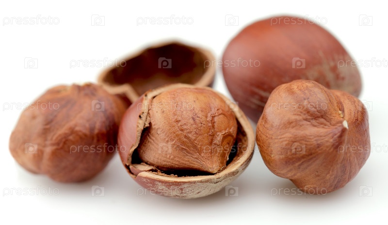 Кучка лесных орешков на белом фоне