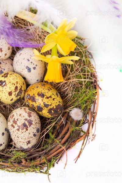 Пасхальные яйца в гнезде и нарциссы