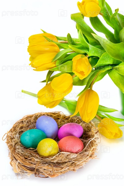 Пасхальные яйца в гнезде и тюльпаны