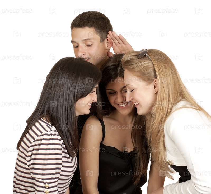 Молодой парень подслушивает разговор трех подруг, на белом фоне