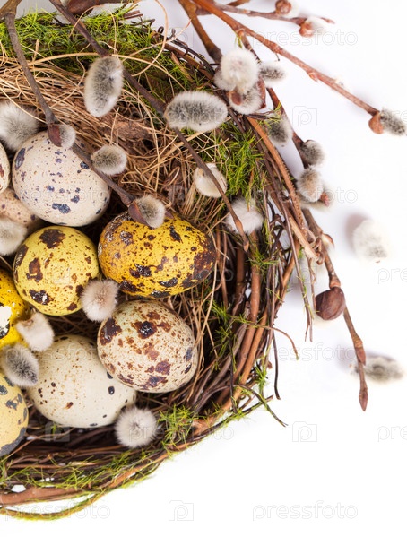Пасхальные яйца в гнезде и нарциссы