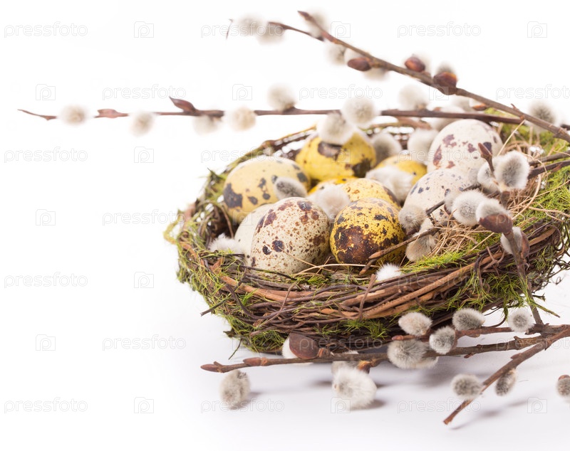 Пасхальные яйца в гнезде и нарциссы