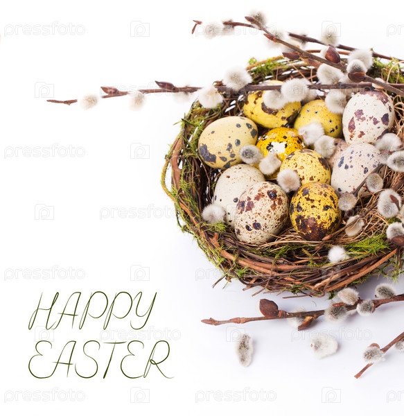 Пасхальные яйца в гнезде и нарциссы