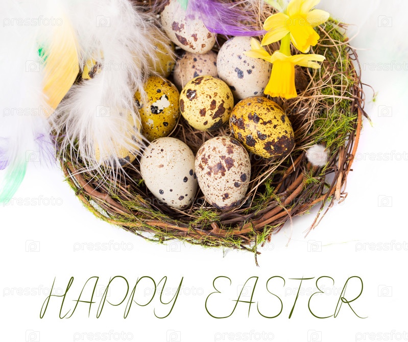 Пасхальные яйца в гнезде и нарциссы