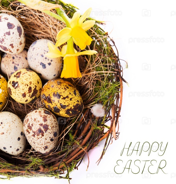 Пасхальные яйца в гнезде и нарциссы