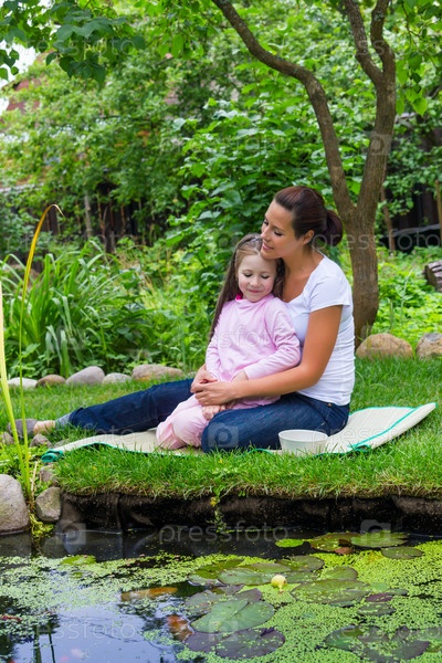 Женщина с дочерью кормит рыб