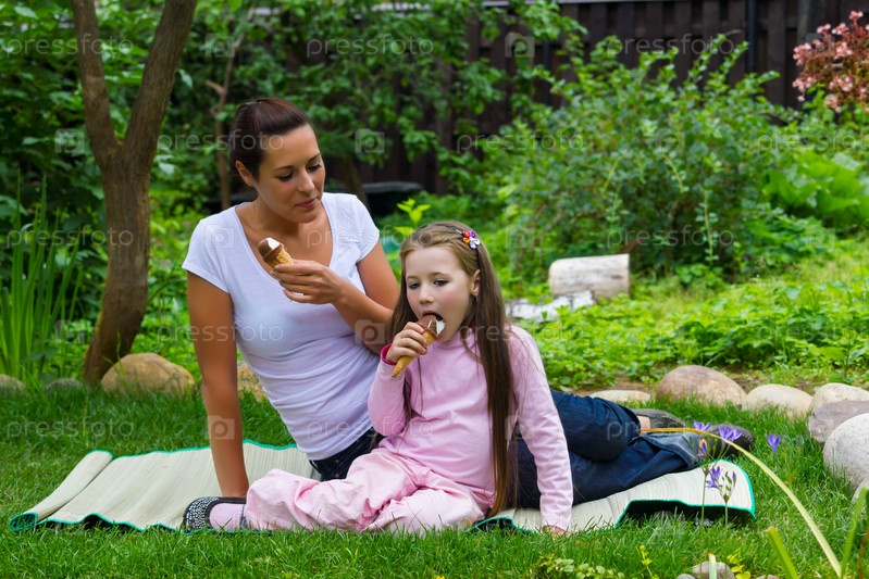 Женщина с дочерью едят мороженое