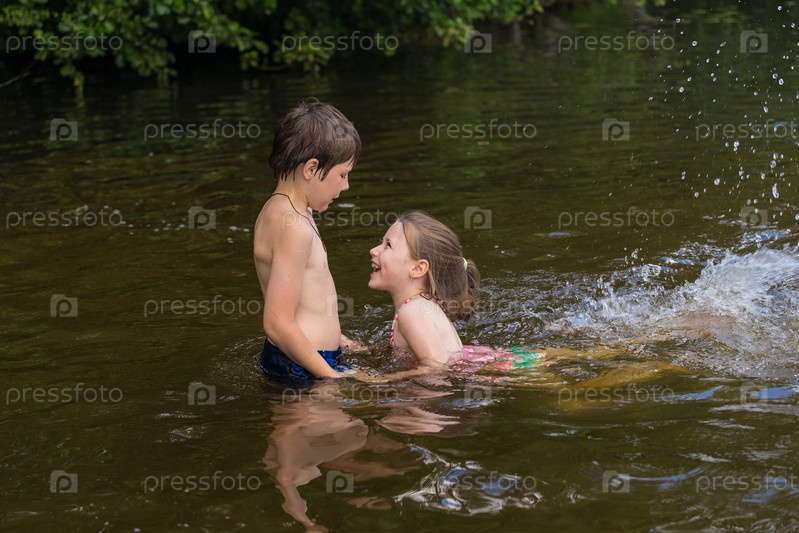 Мальчик учит младшую сестру плавать