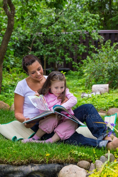 Мать и дочь читают книгу на свежем воздухе