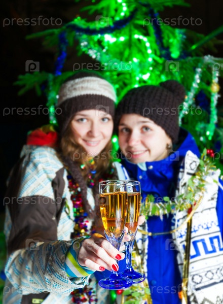Две девушки с шампанским возле елки
