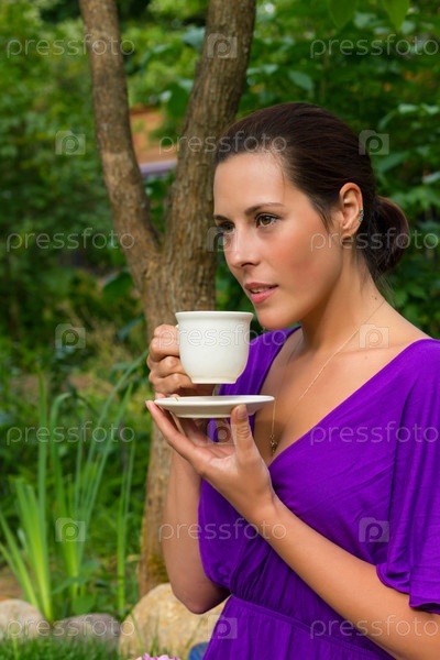 Красивая молодая женщина пьет кофе