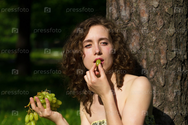 Красивая женщина ест виноград