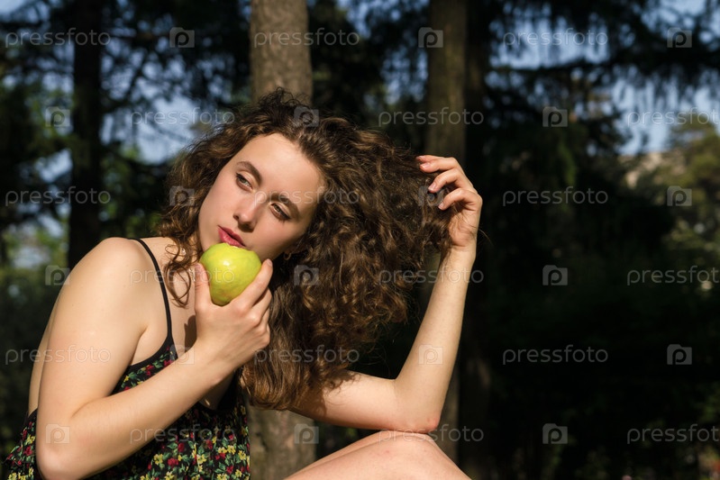 Красивая молодая женщина ест яблоко