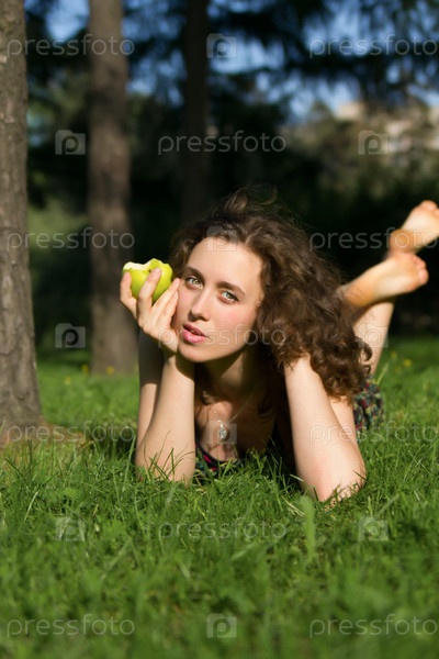 Красивая молодая женщина ест яблоко