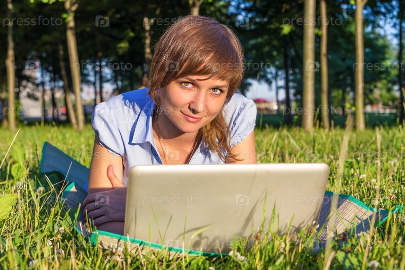 Молодая женщина с ноутбуком на улице