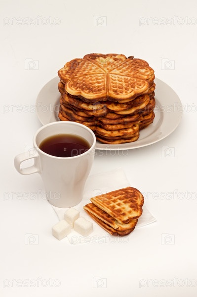 Домашние вафли, чашка чая и кусочки сахара на белом фоне