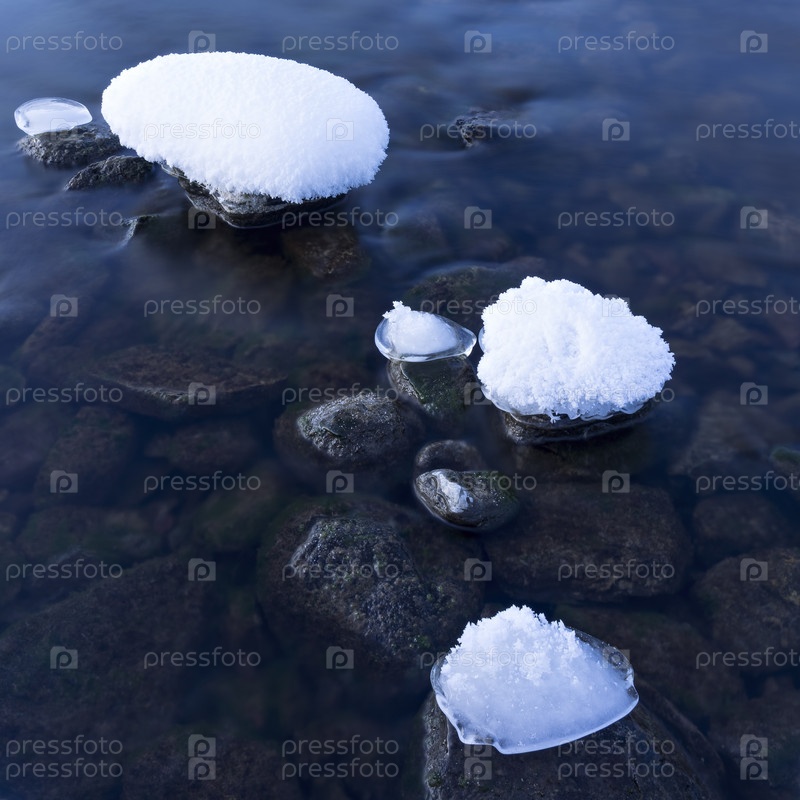 Заснеженные камни в воде. Телецкое озеро, Республика Алтай, Россия