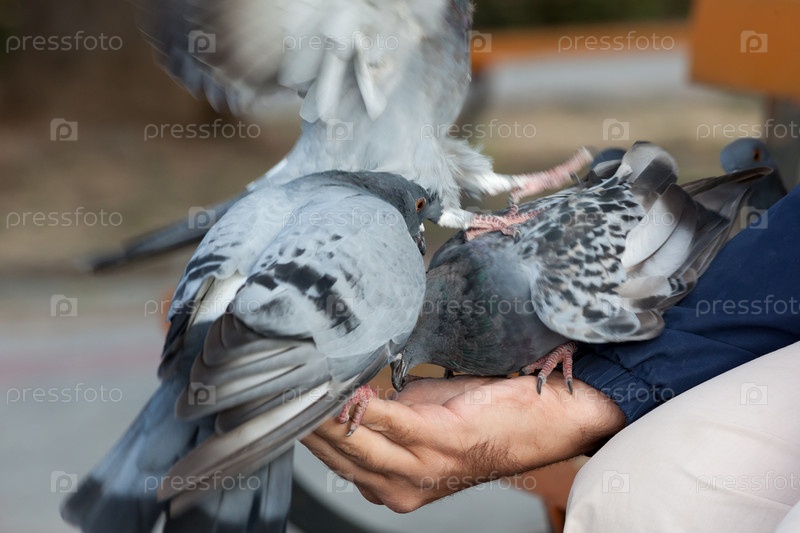 Человек кормит голубей с руки