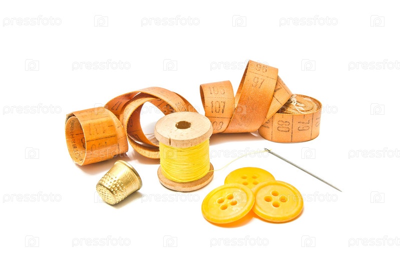 Катушка желтой нити, наперсток и желтые пуговица