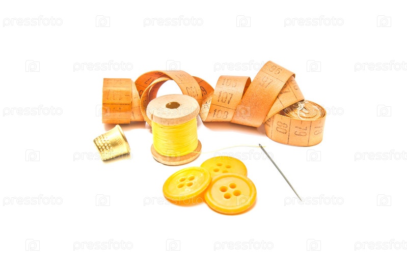 Катушка желтой нити, наперсток и желтые пуговица